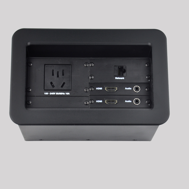 JS-Z401自收式接線盒提供了一個(gè)整潔、緊湊、簡單的連接解決方案,接線盒采用掀蓋式結(jié)構(gòu)設(shè)計(jì),使用時(shí)掀起內(nèi)面板,各種線纜及接口展現(xiàn)出來;線纜采用自收式設(shè)計(jì),使用時(shí)直接拉出線纜連接后即可使用,使用完畢線纜可自動(dòng)收回接線盒內(nèi),實(shí)現(xiàn)了開會(huì)簡單入手、閉會(huì)就走,使整個(gè)會(huì)議桌面整潔、有序。