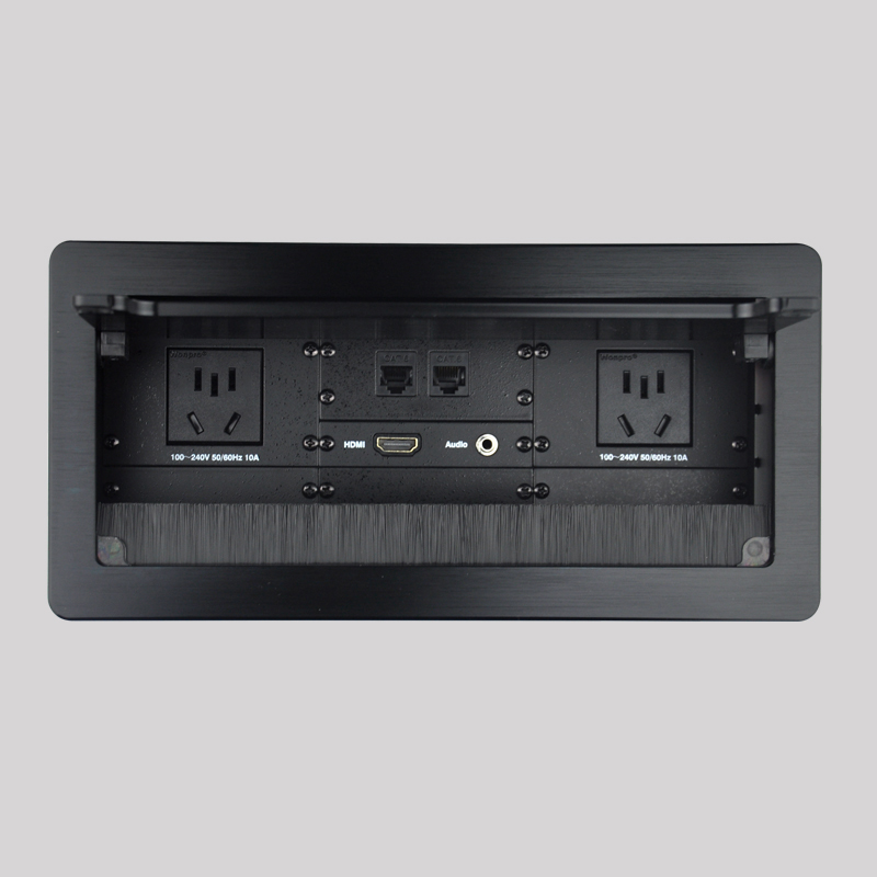 ? JS-5+系列可藏式接線盒提供了一個(gè)整潔、緊湊、簡單的鏈接解決方案。接線盒采用氣動(dòng)與機(jī)械閉鎖式結(jié)構(gòu)、上下接口貫穿式設(shè)計(jì),巧妙的實(shí)現(xiàn)升起和閉合。使用時(shí)只需輕按接線盒頂部,釋放機(jī)械閉鎖,接線盒被氣動(dòng)裝置順暢撐開,隱藏的電源、網(wǎng)絡(luò)、電話、視頻、音頻等各種接口即呈45°展現(xiàn)出來。使用完畢后,輕按接線盒頂部,機(jī)械閉鎖關(guān)閉,各種接口隱藏起來,隱藏后的接線盒與平臺(tái)保持水平。